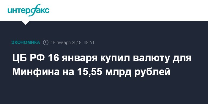 Москва. 18 января. INTERFAX.RU - ЦБ РФ 16 января купил валюту для Минфина в рамках бюджетного правила на 15,55 млрд рублей, следует из данных Банка России.