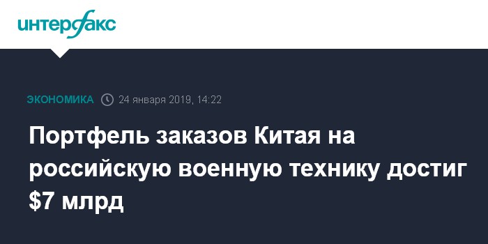 Москва. 24 января. INTERFAX.RU - Китай заказал российской военной техники на общую сумму более $7 млрд, сообщил глава Федеральной службы по военно-техническому сотрудничеству России Дмитрий Шугаев.