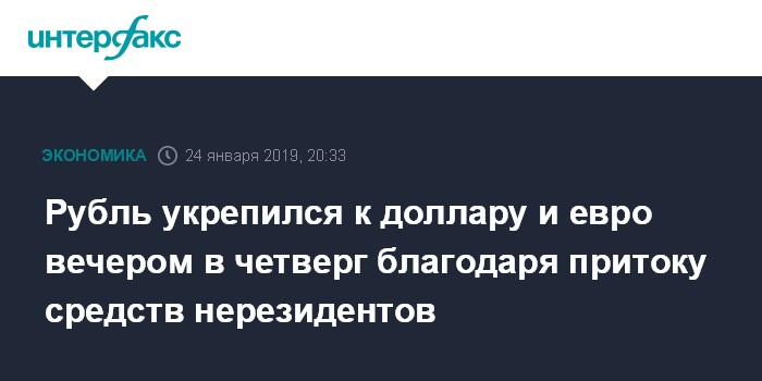 Как отмечают эксперты "Интерфакс-ЦЭА", рубль демонстрирует позитивную динамику в основных валютных парах на вечерних торгах благодаря прежде всего притоку иностранного капитала в условиях локального снижения санкционных рисков из-за приостановки работы американского правительства. Подтверждением этому может служить также продолжающийся рост стоимости российских валютных и рублевых госооблигаций, а также акций Сбербанка РФ, которые в последнее время служат хорошим индикатором отношения нерезидентов к российским активам.