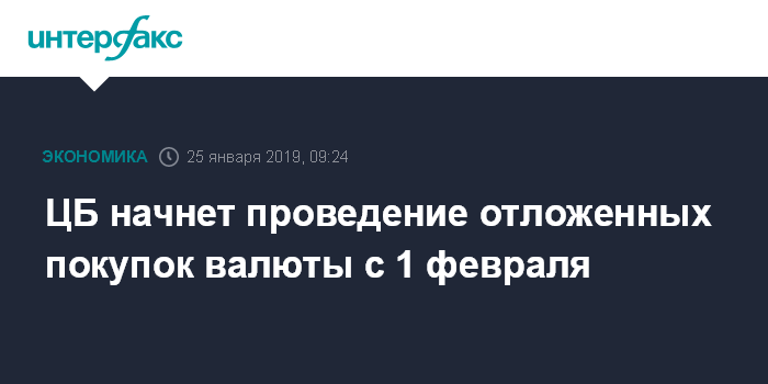Москва. 25 января. INTERFAX.RU - ЦБ РФ принял решение приступить с 1 февраля 2019 года к проведению отложенных в 2018 году покупок иностранной валюты на внутреннем рынке в рамках реализации механизма бюджетного правила, говорится в сообщении ЦБ.