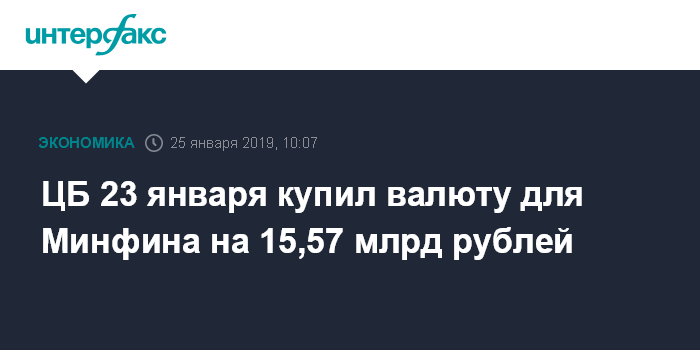 Москва. 25 января. INTERFAX.RU - ЦБ РФ 23 января купил валюту для Минфина в рамках бюджетного правила на 15,57 млрд рублей, следует из данных Банка России.