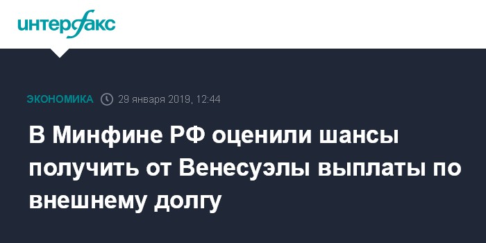 Москва. 29 января. INTERFAX.RU - Венесуэла, погрузившаяся вслед за экономическим кризисом в кризис политический, через два месяца должна выплатить РФ больше $100 млн по внешнему долгу, и у российского Минфина нет уверенности, что обслуживание обязательств будет идти по графику.