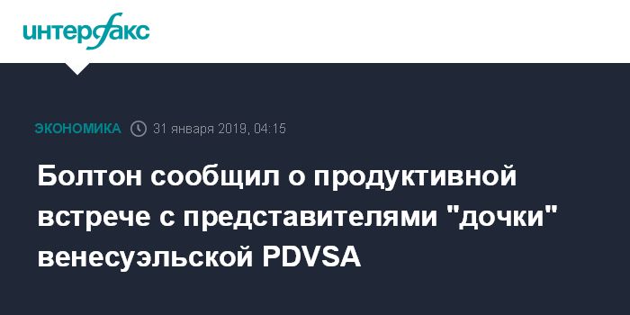 Москва. 31 января. INTERFAX.RU - Советник президента США по нацбезопасности Джон Болтон заявил, что провел продуктивную встречу с представителями дочерней структуры венесуэльской нефтяной компании PDVSA - Citgo.