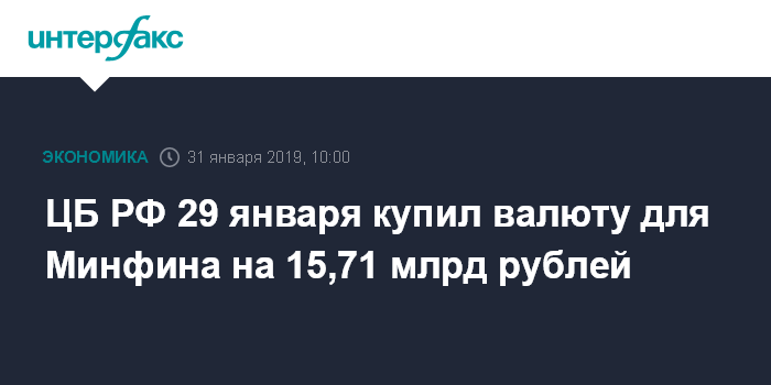 Москва. 31 января. INTERFAX.RU - ЦБ РФ 29 января купил валюту для Минфина в рамках бюджетного правила на 15,71 млрд рублей, следует из данных Банка России.