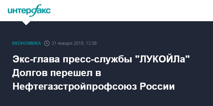 Москва. 31 января. INTERFAX.RU - Пресс-секретарем Общероссийского профессионального союза работников нефтяной, газовой отраслей промышленности и строительства (Нефтегазстройпрофсоюз) России назначен Дмитрий Долгов, который с сентября 1995 по август 2014 года работал в пресс-службе нефтяной компании "ЛУКОЙЛ", в том числе, и в качестве ее руководителя.