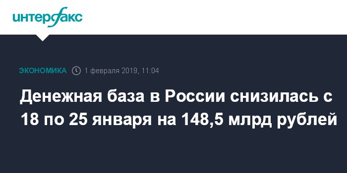 На 18 января денежная база в России равнялась 10384,8 млрд рублей. Таким образом, за период она снизилась на 1,43%, или на 148,5 млрд рублей.