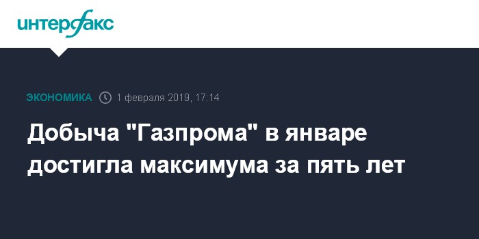 Москва. 1 февраля. INTERFAX.RU - Добыча газа "Газпрома" в январе 2019 года выросла на 4% - до 47,4 млрд куб. м, что является максимумом за последние пять лет. Больше в последние годы "Газпром" добывал в 2014 году - 48,9 млрд куб. м.