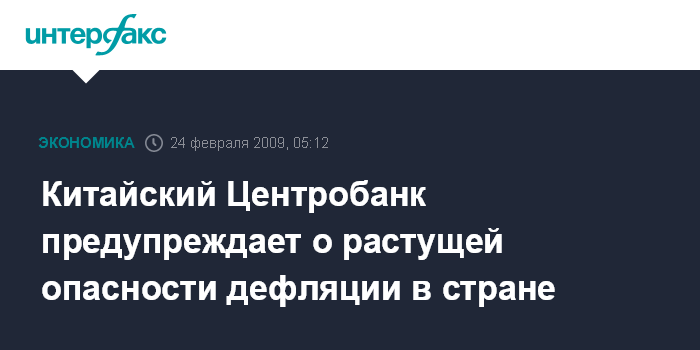 Пекин. 24 февраля. ИНТЕРФАКС-КИТАЙ - Несмотря на достаточно серьезное влияние мирового финансово-экономического кризиса, сохраняются возможности стабильного развития китайской экономики, однако растет и опасность дефляции, предупредил Народной банк Китая (китайский Центробанк - ИФ).