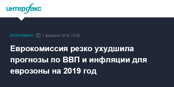 Москва. 7 февраля. INTERFAX.RU - Европейская комиссия (ЕК) ухудшила оценку роста ВВП еврозоны на 2019 год до 1,3% с ожидавшихся в ноябре 1,9% на фоне неопределенности в отношении процесса выхода Великобритании из Евросоюза и замедления темпов роста экономики Китая.