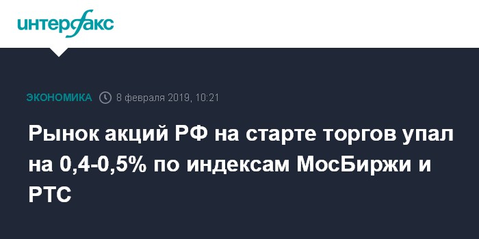 Москва. 8 февраля. INTERFAX.RU - Рынок акций РФ открылся в пятницу дальнейшим снижением цен blue chips на фоне проседающих мировых площадок из-за опасений по поводу торговых переговоров США и Китая; индексы МосБиржи и РТС за минуту торгов потеряли 0,4-0,5%, пробив рубежи 2500 и 1200 пунктов соответственно.