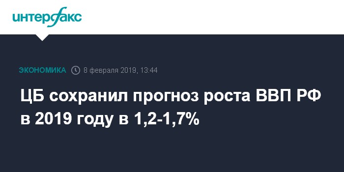 Москва. 8 февраля. INTERFAX.RU - ЦБ РФ оставил неизменным свой прогноз по росту ВВП на 2019 год в интервале 1,2-1,7%, говорится в сообщении Банка России по итогам заседания, на котором он сохранил ключевую ставку на уровне 7,75%.