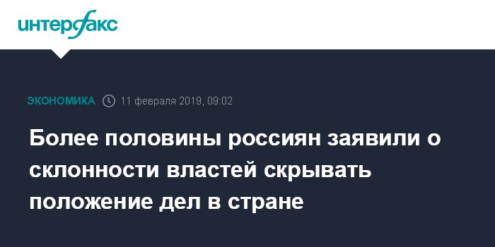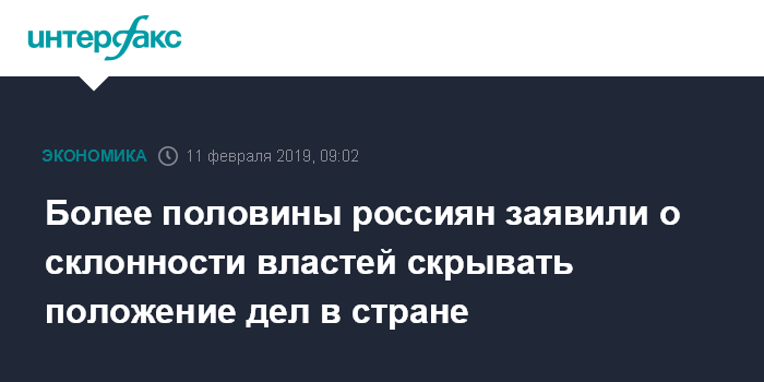 Москва. 11 февраля. INTERFAX.RU - Более половины (52%) россиян считают, что федеральные власти и высокопоставленные чиновники склонны скрывать правду о реальном положении дел в экономике, медицине, пенсионном обеспечении и борьбе с преступностью, сообщает "Левада-центр" по итогам опроса.