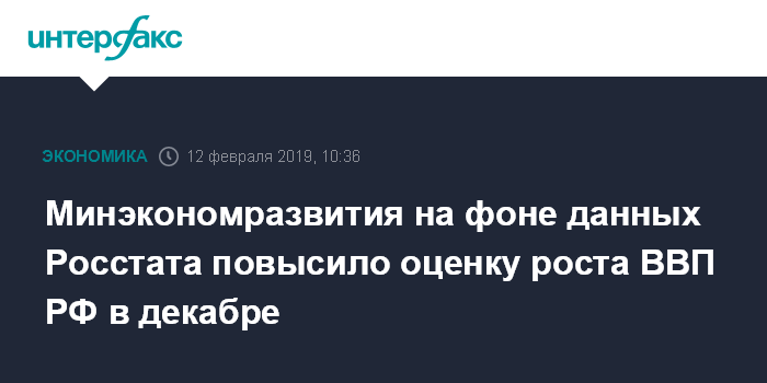 Москва. 12 февраля. INTERFAX.RU - Минэкономразвития повысило оценку роста ВВП РФ в декабре 2018 года до 2,2% с 1,9%, следует из мониторинга "Картина экономики", опубликованном ведомством во вторник.