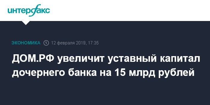 Москва. 12 февраля. INTERFAX.RU - Госкорпорация "ДОМ.РФ" планирует увеличить уставный капитал одноименного дочернего банка на 15 млрд рублей, свидетельствуют материалы кредитной организации.