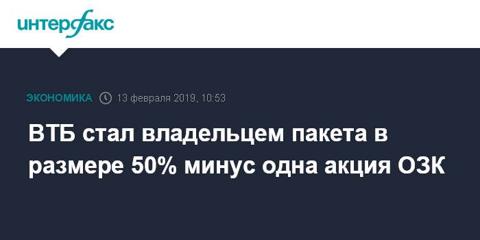 ВТБ стал владельцем пакета в размере 50% минус одна акция ОЗК