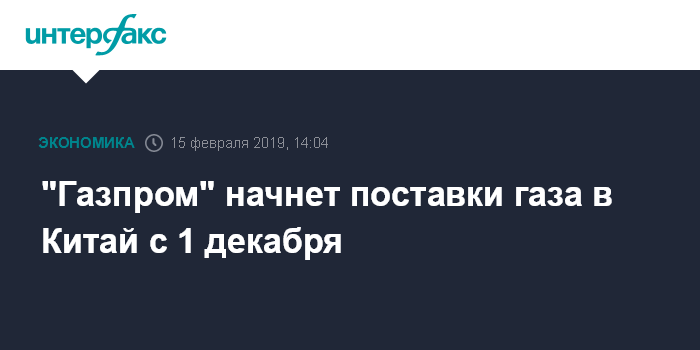 Москва. 15 февраля. INTERFAX.RU - "Газпром" планирует начать поставки газа в Китай по "западному маршруту" с 1 декабря 2019 года, раньше намеченного срока, говорится в сообщении компании.
