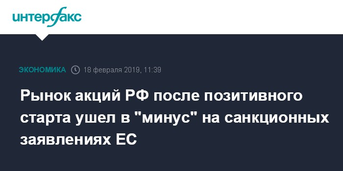 Москва. 18 февраля. INTERFAX.RU - Рынок акций РФ после позитивного старта торгов на фоне выросших мировых площадок на оптимизме в отношении ожидаемого торгового соглашения США-КНР ушел в "минус" по индексам из-за укрепления рубля и новых санкционных заявлений Евросоюза.