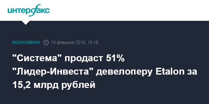 Москва. 19 февраля. INTERFAX.RU - ПАО АФК "Система" объявила о продаже 51% акций "Лидер-Инвеста" девелоперу Etalon Group за 15,2 млрд рублей.