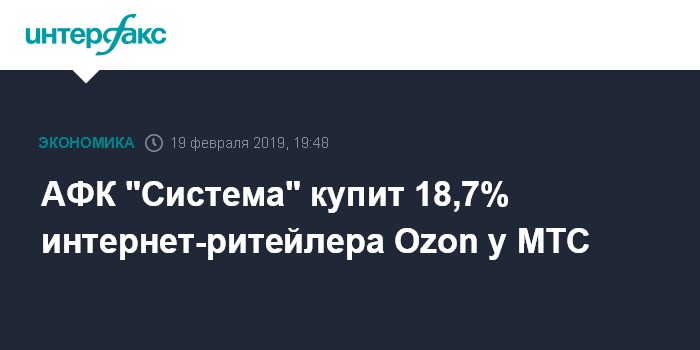 Москва. 19 февраля. INTERFAX.RU - АФК "Система" подписала обязывающее соглашение о покупке у ПАО "МТС" 18,7% акций компании Ozon Holdings Limited за 7,9 млрд рублей, сообщили стороны.