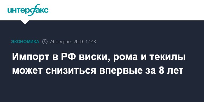 Москва. 24 февраля. INTERFAX.RU - Поставки в Россию виски, рома, текилы, джина и абсента, которые последние годы серьезно конкурировали с водкой на российском алкогольном рынке, в этом году могут снизиться впервые за последние восемь лет.