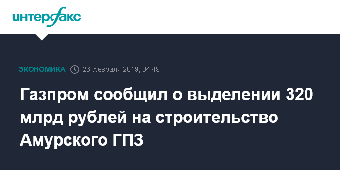 Москва. 26 февраля. INTERFAX.RU - "Газпром" в 2019 году направит на стройку Амурского газоперерабатывающего завода (ГПЗ) 320 млрд рублей, сообщается в презентации компании ко Дню инвестора в Гонконге.