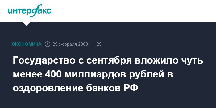 Государство с сентября вложило чуть менее 400 миллиардов рублей в оздоровление банков РФ