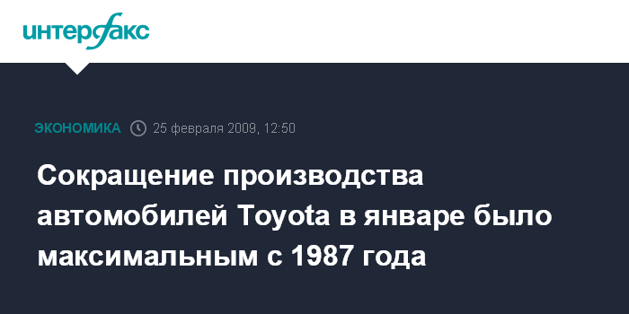 Москва. 25 февраля. INTERFAX.RU - Японская Toyota Corp., крупнейшая автомобильная компания мира, сократила производство в январе максимальными темпами более чем за два десятилетия, поскольку мировая рецессия и финансовый кризис привели к ослаблению спроса на новые автомобили, сообщило агентство Bloomberg.