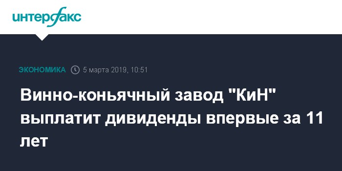 Москва. 5 марта. INTERFAX.RU - Московский винно-коньячный завод "КиН" в 2019 году выплатит дивиденды впервые за 11 лет и направит на эти цели рекордную за всю свою историю сумму.