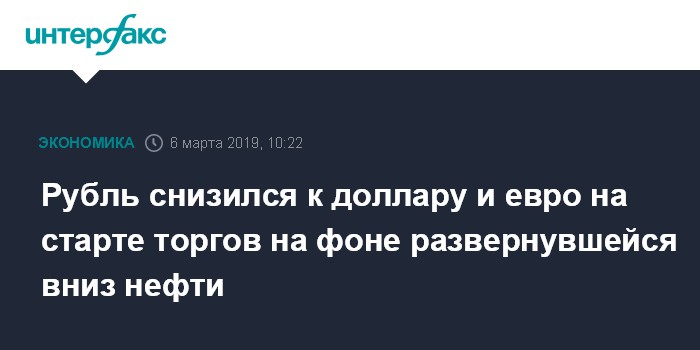 По мнению экспертов "Интерфакс-ЦЭА", плавное снижение курса рубля по отношению к доллару и евро на старте торгов связано, прежде всего, с наметившимся ухудшением ситуации на мировых нефтяных площадках под давлением опубликованных накануне данных Американского института нефти (API) о существенном увеличении товарных запасов в США. Майские фьючерсы на Brent на лондонской бирже ICE Futures к 10:01 по Москве подешевели на 0,5% - до $65,53 за баррель. Котировки фьючерсов на WTI на апрель на Нью-йоркской товарной бирже снизились утром на 0,69% - до $56,17 за баррель.