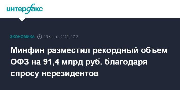 Москва. 13 марта. INTERFAX.RU - Минфин РФ в среду, 13 марта, благодаря спросу нерезидентов разместил на еженедельных первичных аукционах рекордный объем облигаций федерального займа (ОФЗ) - на 91,434 млрд рублей. Таким образом, несмотря на сохраняющиеся санкционные риски, инвесторы не боятся вкладываться в российские долговые бумаги.