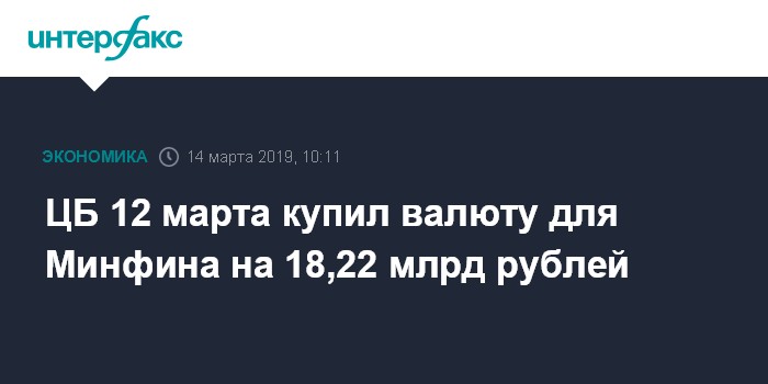 Москва. 14 марта. INTERFAX.RU -- ЦБ РФ 12 марта купил валюту для Минфина в рамках бюджетного правила на 18,22 млрд рублей, следует из данных Банка России.
