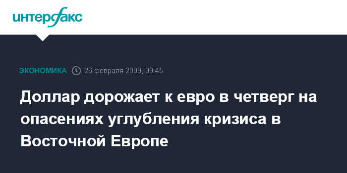 Москва. 26 февраля. INTERFAX.RU - Доллар США дорожает к евро в четверг на опасениях углубления финансового кризиса в Восточной Европе, сообщило агентство Bloomberg. Росту доллара также способствуют ожидания снижения базовой процентной ставки Европейского центрального банка (ЕЦБ) на мартовском заседании.
