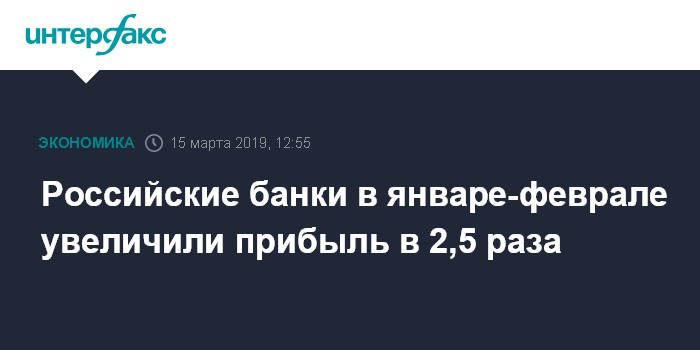 Москва. 15 марта. INTERFAX.RU - Российские банки в январе-феврале 2019 года увеличили прибыль в 2,5 раза - до 445 млрд рублей по сравнению с 178 млрд рублей годом ранее, следует из статистики ЦБ РФ.