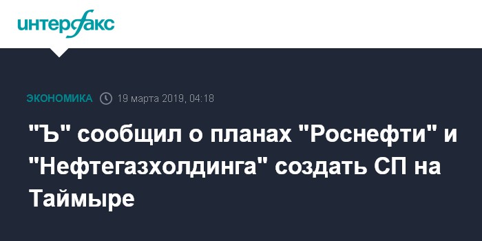 Москва. 19 марта. INTERFAX.RU - "Роснефть" и "Нефтегазхолдинг" могут создать совместное предприятие на Таймыре, сообщает во вторник газета "Коммерсант".