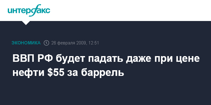 "Даже если цена пойдет вверх и будет не $41 за баррель (среднегодовая цена, закладываемая в новый проект бюджета на 2009 г. - прим. ИФ-АФИ), а $44 за баррель и даже $50-55 а баррель, то ВВП все равно будет падать", - сказал он на коллегии Федеральной налоговой службы.