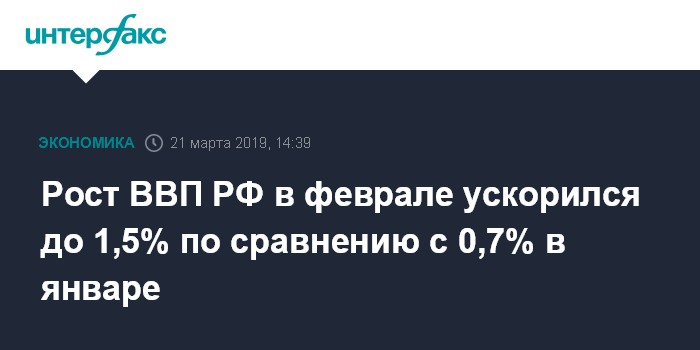 Москва. 21 марта. INTERFAX.RU - Рост ВВП РФ в феврале 2019 года, по оценке Минэкономразвития, ускорился до 1,5% в годовом сравнении с 0,7% в январе, говорится в традиционном докладе министерства.