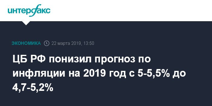 Москва. 22 марта. INTERFAX.RU - Банк России понизил прогноз по инфляции на 2019 год до 4,7-5,2% с 5-5,5%, говорится в пресс-релизе регулятора по итогам заседания совета директоров.