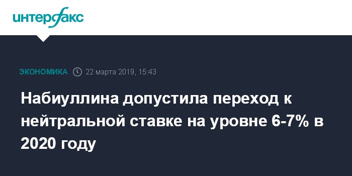 Москва. 22 марта. INTERFAX.RU - ЦБ РФ считает возможным переход к нейтральной ставке на уровне 6-7% в 2020 году, заявила председатель Банка России Эльвира Набиуллина на пресс-конференции в пятницу.