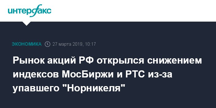 Рынок акций РФ открылся снижением индексов МосБиржи и РТС из-за упавшего "Норникеля"