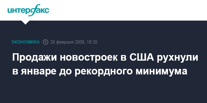 Вашингтон. 26 февраля. INTERFAX.RU - Продажи новых домов в США в январе рухнули на 10,2% - до рекордного минимума, сообщило агентство Bloomberg со ссылкой на данные министерства торговли США.