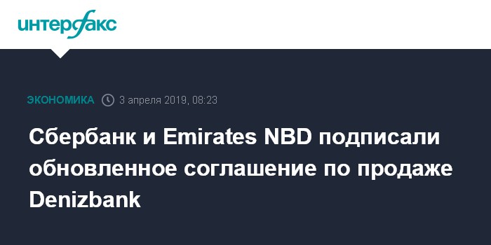 Москва. 3 апреля. INTERFAX.RU - Сбербанк России и Emirates NBD подписали обновленное соглашение по купле-продаже турецкого Denizbank за 15,48 млрд лир ($2,76 млрд), говорится в пресс-релизе Сбербанка.