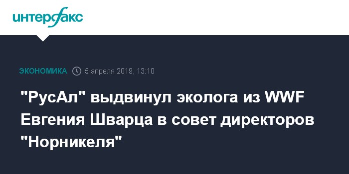 Москва. 5 апреля. INTERFAX.RU - "РусАл" , владеющий 28% акций "Норильского никеля", выдвинул известного эколога, директора департамента природоохранной политики Всемирного фонда дикой природы (WWF) в России Евгения Шварца на одно из принадлежащих компании кресел в совете директоров ГМК, сообщили "Интерфаксу" три источника, знакомых с ситуацией.