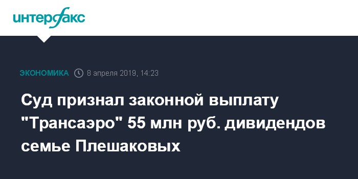 Москва. 8 апреля. INTERFAX.RU - Арбитражный суд Петербурга и Ленинградской области признал законными выплаты авиакомпанией "Трансаэро" около 55 млн рублей дивидендов за 2013 год основным акционерам - Ольге и Александру Плешаковым, а также некоторым миноритарным акционерам - членам их семьи, следует из опубликованного в понедельник определения суда.