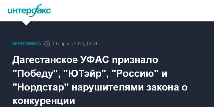 Москва. 10 апреля. INTERFAX.RU - Управление Федеральной антимонопольной службы (УФАС) по республике Дагестан признало авиакомпании "Россия", "Победа", "ЮТэйр" и "Нордстар" нарушителями федерального закона "О защите конкуренции" из-за необоснованных тарифов эконом-класса на пассажирские перевозки по маршруту Махачкала - Москва - Махачкала, сообщается на сайте ведомства.
