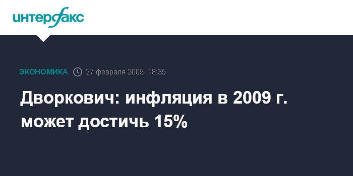 Красноярск. 27 февраля. INTERFAX.RU - Инфляция в РФ в 2009 г. может превысить текущий официальный прогноз и достичь 15%, сказал помощник президента РФ Аркадий Дворкович.