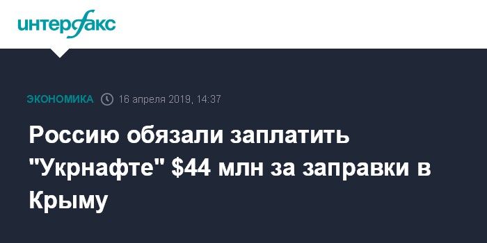 Москва. 16 апреля. INTERFAX.RU - Международный арбитражный суд принял решение взыскать с Российской Федерации в пользу ПАО "Укрнафта" более $44 млн компенсации за национализацию имущества компании после присоединения Крыма к РФ.