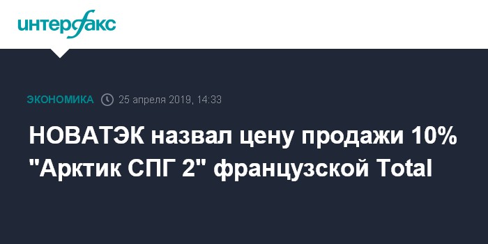 Москва. 25 апреля. INTERFAX.RU - НОВАТЭК в опубликованной в четверг отчетности по МСФО раскрыл финансовые условия продажи 10% своего нового СПГ-проекта - ООО "Арктик СПГ 2" французской Total.