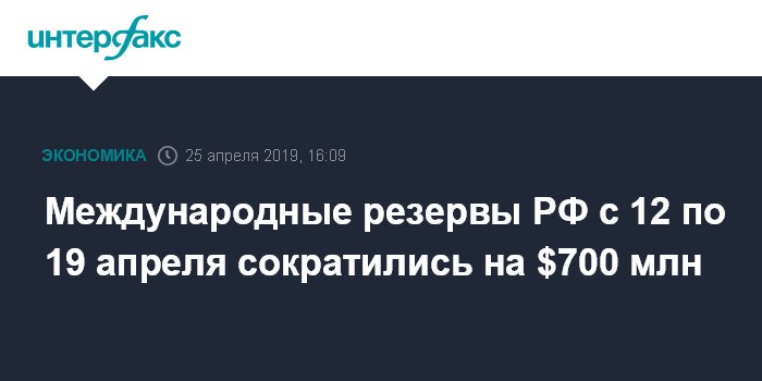 Международные резервы РФ с 12 по 19 апреля сократились на $700 млн