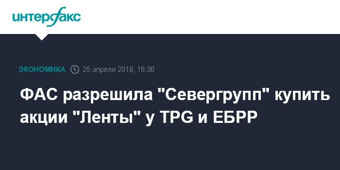 Москва. 25 апреля. INTERFAX.RU - Федеральная антимонопольная служба одобрила сделку по покупке структурой Алексея Мордашова долей TPG и ЕБРР в ритейлере "Лента", сообщил гендиректор ритейлера Герман Тинга.