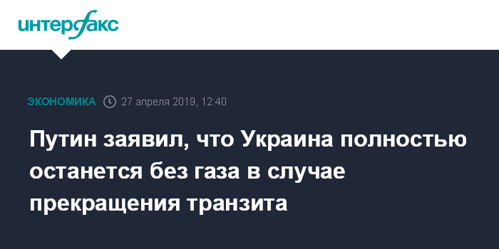 Москва. 27 апреля. INTERFAX.RU - Газоснабжение Украины полностью зависит от транзита российского газа через нее, заявил президент России Владимир Путин на пресс-конференции в Пекине. Отвечая на вопрос о перспективах переговоров с избранным президентом Украины Владимиром Зеленским, Путин упомянул в числе вопросов, которые стоят на повестке дня двух стран и вопросы экономического характера, которые, в том числе, связаны транзитным договором "Газпрома" с "Нафтогазом", который истекает в 2019 году.